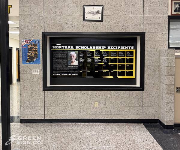Green Sign Company was proud to partner with Milan High School in Milan, Indiana, on a project that celebrates student achievement in a big way! The school reached out to our team looking for a custom sign to recognize their scholarship recipients, and we were honored to bring their vision to life. Our design team created a custom layout that would fit seamlessly within the school’s space and reflect their pride and tradition. From concept to completion, our team handled every step — design, fabrication, and installation — ensuring a high-quality display built to last for years to come. The finished sign not only highlights the accomplishments of Milan High School’s hardworking students but also enhances the spirit and professionalism of their campus. It stands as a lasting tribute to dedication, perseverance, and excellence in education. Project Type: GSC Custom Sign Customer Category: Schools #CustomSigns #SchoolSignage #MilanHighSchool #EducationBranding #GreenSignCompany #IndianaSigns #DesignFabricationInstallation #StudentAchievement